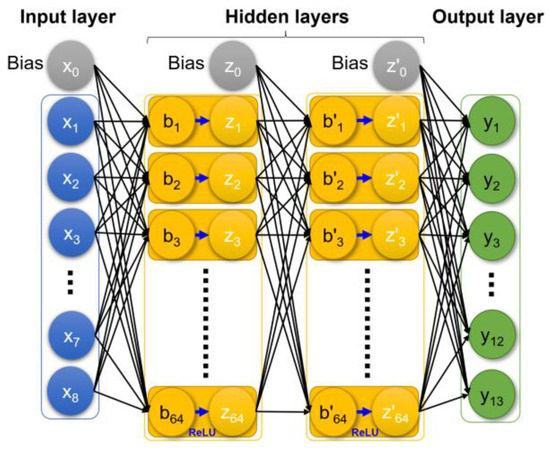The ANN model is shown in Figure 3. The concentrations of target gases were predicted using the ANN. The structure of the neural network comprised an input layer with eight nodes (x1–x8) for the standardization values of sensor responses from eight sensors as explanatory variables; two hidden layers with 64 nodes (b1–b64 and b′1–b′64) with rectified linear units (ReLU; z1–z64 and z′1–z′64); and an output layer with 13 nodes (y1–y13) for the concentrations of the 13 target gases as objective variables. The ANN performed using 5-fold cross validation. All data points (676 + 4056 = 4732) were randomly divided into five parts, one of which was used as test data (946 or 947 data points) and the rest as training data (3786 or 3785 data points). First, all coefficients for moving data to the next layer in the ANN model (corresponding to the black arrows in Figure 3) were optimized using training data. Subsequently, all data points of the test data were substituted into the input layer for collecting the predicted concentrations of the 13 target gases from the output layer. By repeating the ANN five times with 5-fold cross-validation, each data point was the test data only once. Among the hyperparameters, the batch size was set to 32, and the number of epochs was the value at which the average loss function of the test data in the 5-fold cross-validation was minimized.