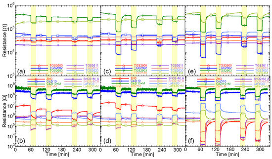 Figure 4e,f show the change in the resistance of each sensor against double gases, including numbers 2 and 6. The concentration combinations were levels 3 + 3, 3 + 1, 1 + 1, and 1 + 3, in the order shown in Figure 4e,f. Levels 3 + 1 and 1 + 3 had approximately the same level of resistance change, but the resistance change varied depending on the sensor. These results indicate that the relationship between the magnitude of the response of each sensor to the gas type and concentration was different.