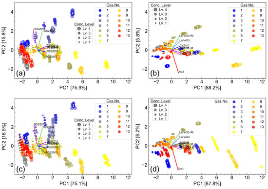 PCA scores and eigenvectors: sensor array and dataset are (a) C and 1 min data, (b) L and 1 min data, (c) C and 12 min data, and (d) L and 12 min data, respectively. Numbers on plots from Lv. 4 indicate gas numbers.