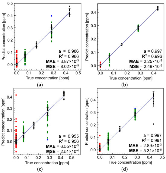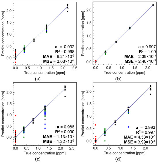 Figure 6 and Figure 7 show the relationship between the true and predicted concentrations for numbers 12 and 6, respectively. The results for all the target gases are shown in Figures S7–S10. The difference between Figure 6a,c or Figure 6b,d is the interval used to obtain the sensor response values for the datasets. In both cases, the 1 min dataset, which has a narrower data range and less drift influence, had smaller plot variations, and the values listed in the panels were also better. The difference between Figure 6a,b or Figure 6c,d is the sensor array. In both cases, sensor array L had smaller plot variations, and the values listed in the panel were also better. Furthermore, in both panels, the variation in the predicted concentration plots for a single gas (black) was lower than that for double gases (blue, green, and red). These results show the same tendencies as the correct answer rates shown in Table 4. Figure 7 shows number 6, which had a larger concentration range than number 12 in Figure 6. As shown in Figure 6, the differences in the range of the data acquired by the dataset and in the sensor arrays showed the same trend. In addition, the results in Figure 7 are better than those in Figure 6, indicating that higher gas concentrations afforded more accurate results.