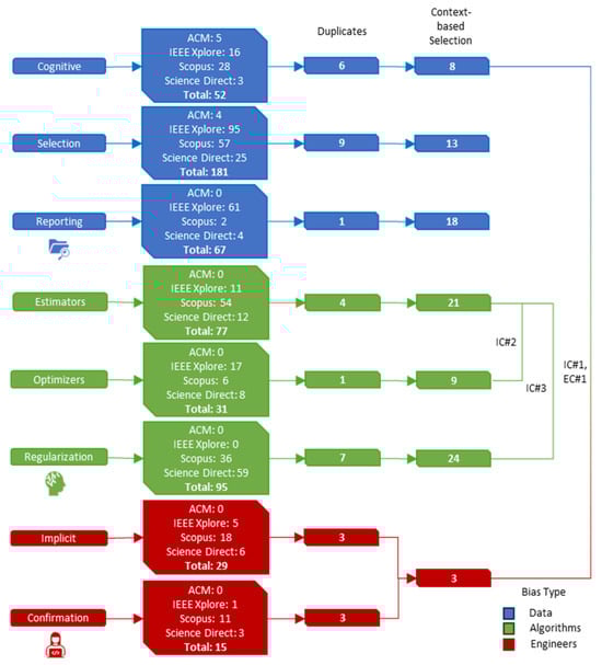 IC#1 and EC#1 refer to the studies related to all three (3) categories of bias (i.e., data, algorithms and engineers). IC#2 refers to the studies related to the two (2) subtypes of algorithm bias, namely estimator bias and optimizer bias while IC#3 corresponds to the studies that are related to algorithm bias (i.e., including regularization bias). A visualization of the process followed to select the studies that are analyzed in this manuscript, which was also presented above, is depicted in Figure 2.