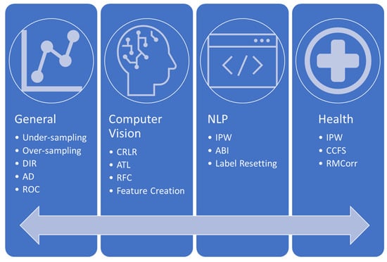 According to the above-mentioned findings, there exist some common issues with regard to data bias, as well as corresponding techniques that can be applied to mitigate it. More specifically, as stated in the beginning of this section, common techniques that can be applied to address data bias, regardless of the use case, are under-sampling and over-sampling. As for use-case-specific approaches, major issues regarding data bias are mostly common in NLP, computer vision and the health domain. The relatively common domains that are affected from data bias and the corresponding solutions that have been proposed in the literature and presented above are depicted in Figure 3.