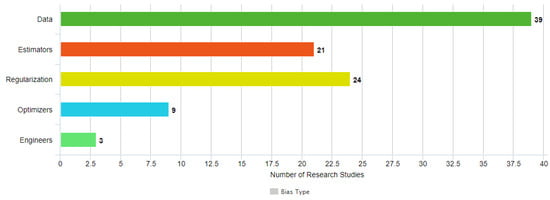 In another approach [75], the authors focus on financial data and the mitigation of the corresponding reporting bias that might occur, either due to human error or deliberately as part of a fraud. In this case, a hybrid method is showcased that combines the input of human experts on the corresponding field, as well as the utilization of Shannon entropy analysis to evaluate the information that is provided by the experts. Finally, in order to identify reporting bias in social media data, the authors in [76], compare a set of traditional ML algorithms, namely, Naïve Bayes (i.e., NB), LR and SVM. SVM managed to achieve the highest accuracy in identifying the bias that is present in the data, showcasing that it can be a useful tool for identifying reporting bias in text data.