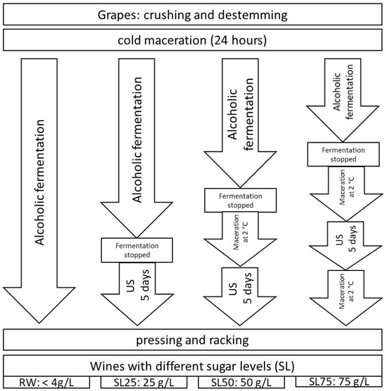 Four different types of wines were produced (Figure 1), distinguished by their final sugar contents. Table 1 summarizes the characteristics of the four assays, identified by their abbreviations. The control wine, with less than 4 g/L of total sugars, was labeled RW (reference wine). The wines with 25 g/L, 50 g/L, and 75 g/L of sugar were labeled SL25, SL50, and SL75, respectively. All the assays included a 24 h prefermentative maceration stage to extract more phenolic and aromatic compounds, following previous research [23].