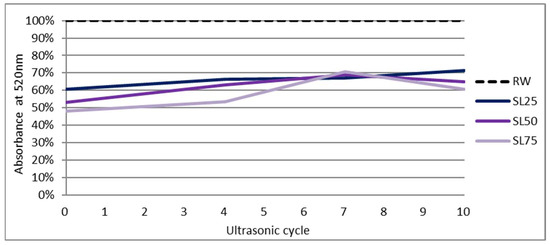 The progress of the extraction was monitored, Figure 2 shows the 3 types of sweet wines, regarding their relative absorbance at 520 nm during the 10 ultrasound cycles. The RW wine, which is the assay processed as red dry wine, is the experiment that presents the highest absorbance and is given a value of 100. The SL25 assay showed an increase in the intensity of the red color after the application of the ultrasonic treatment, reaching its maximum absorbance at cycle 10, with 71% in respect to the RW. The use of ultrasound resulted in an absorbance increment of 16% for the SL25 wine. On the other hand, SL50 and SL75 experienced greater increments than SL25, with 23% for SL50 and 27% for SL75 after 7 ultrasound cycles. However, after the first 7 cycles, their absorbance at 520 nm began to decrease.