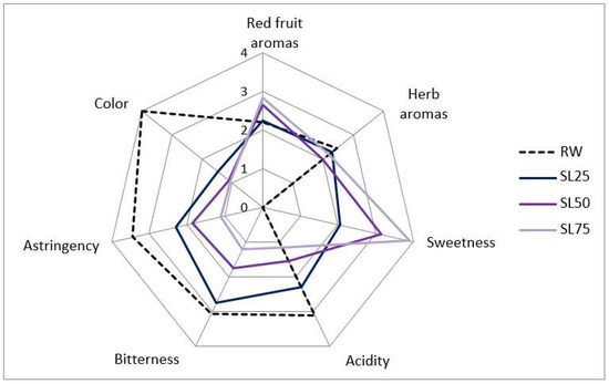 In the comparative–descriptive tasting (Figure 3), all the judges considered the RW to have more color and awarded it with a maximum score of 4, the sweet reds scored around 1.3 for color. This agrees with the concentrations of individual phenolic compounds and anthocyanins that had been measured in our study, where the RW had significantly higher concentrations than SL75, which stabilized its color and resulted in a more intense color. The RW and SL25 wines had less red fruit aromas (2.2 score) than SL50 and SL75 (2.8 score). Regarding vegetal aromas, no differences were found between the four wines, while with respect to flavors, RW was awarded a score of 0 for sweetness and SL75 was awarded a score of 4. Both SL50 and SL25 presented intermediate values (3.15 and 2.05, respectively). The RW was given the highest score for astringency, bitterness and acidity, while SL75 was rated as the lowest with respect to these parameters. Astringency and bitterness are associated with certain chemical compounds such as catechin or epicatechin, and generally to non-anthocyanic phenolic compounds. The RW had a significantly higher concentration than SL75, which resulted in a notable effect on its flavor. On the other hand, an inverse relationship was observed between the level of sweetness of the wines and their acidity, bitterness and astringency descriptors. For example, sweet wines were perceived as less bitter. Thus, SL75 reached a value of 1.2, SL50 1.75, and SL25 2.75. The same results were observed for acidity and astringency. These aspects are obviously important for Chinese consumers.
