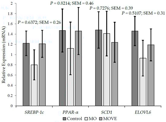 Gene expression in the Longissimus lumborum muscle of grazing lambs supplemented with macadamia oil and vitamin E. Control: control diet. MO: Control + macadamia oil. MOVE: MO + vitamin E. SEM: standard error of the mean.