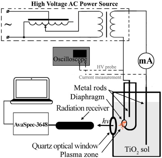 The scheme of setup for generation of underwater AC diaphragm discharge is shown in Figure 1. Two metal electrodes were immersed in a volume of liquid. One of them was placed in a quartz ampoule with a small hole (diaphragm). The diaphragm diameter was 2 mm. Molybdenum, niobium, or tungsten wires (Shenzhen Tangda Technology Co., Ltd., Shenzhen, China) with a diameter of 0.8 mm were used as metal electrodes. The power supply for the excitation of the discharge consisted of a laboratory autotransformer and a high-voltage step-up transformer. The power supply made it possible to ignite the discharge at voltages up to 10 kV. The alternating-discharge current was 50 mA. All experiments were carried out in a glass cell with a fixed volume of 50 mL. The diaphragm discharge was initiated and propagated at the hole of the quartz ampoule in the bubble. The treatment time was 90 s. A more detailed method of plasma treatment of sol is discussed elsewhere [21]. The cell was equipped with an optical quartz window for recording the radiation spectra of the diaphragm discharge. The discharge-emission spectra (λ = 200–950 nm) were recorded using an AvaSpec ULS-3648 spectrometer (Avantes, Apeldoorn, The Netherlands) at a resolution of 0.3 nm. The ampoule with the diaphragm was placed directly opposite the optical window at a distance of 10 mm. A fiber-optic cable was brought close to the optical window to record the emission spectra.