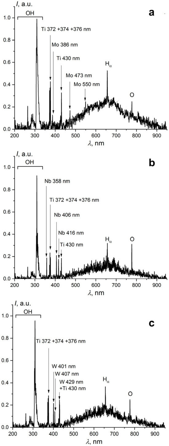 Emission spectra of diaphragm discharge burning in TiO2 sol with Mo (a), Nb (b), and W (c) electrodes.