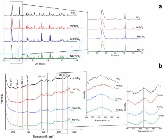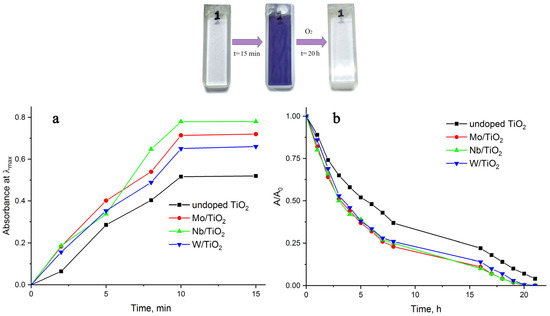 Titanium dioxide is widely known as a photocatalyst, although TiO2 has a wide band gap (3.0–3.2 eV) [1]. The doping method is used to increase the photocatalytic properties under visible light irradiation. Both metals and nonmetals are used as doping agents [2]. In addition to its photocatalytic properties, titanium dioxide has photochromic properties [3]. The main problem with using TiO2 as a photochromic material lies in the low rate of coloring–bleaching processes under light irradiation. The structure of the resulting titanium dioxide may play a key role in this process. For example, the best photochromic characteristics appear in the amorphous structures of tungsten oxide [4]. Moreover, in experiments with TiO2, the amorphous structure has a negligibly low photochromic response [5]. Since TiO2 has a rather low photoresponse, its photochromic properties need to be improved by creating binary structures, doping, and making composites based on polymers and oxide structures. Currently, Ag, Cu, Mo, Nb, V, and W, as ions and oxides, are being intensively studied as doping agents that increase the photochromic characteristics of titanium dioxide. Silver nanoparticles are chosen as dopants because of their pronounced localized surface plasmon resonance in the visible region of the spectrum [6,7]. Copper ions are used because color changes are easily controlled by the reduction process (Cu2+→Cu+) [8]. The choice of transition metal ions (Mo, Nb, V, W) is determined by the fact that the oxide structures of these materials themselves have photochromic properties [4,9,10,11]. In a series of works by Songara et al., the influence of transition metal ions (W6+, Mo6+, and V5+) on the photochromic properties of TiO2 (anatase) was studied [12,13,14]. The bleaching time decreased in the V > Mo > W series. The authors explained this effect in terms of the charge/radius of the doped ion, charge-separation efficiency, and surface acidity. The process of discoloration (oxidation) is explained by the slow release of trapped electrons. Eglitis et al. explained the slow release of the electron by the fact that the electrons are delocalized and stabilized by the extra positive charge of Nb5+ [15].