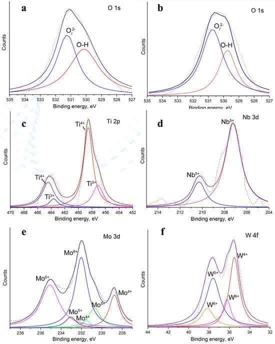 High-resolution XPS spectra of O 1s (for undoped TiO2 (a) and Mo-doped TiO2 as an example (b)), Ti 2p (c), Nb 3d (d), Mo 3d (e), and W 4f (f).