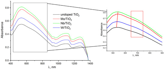 Figure 5 shows the absorption spectra of the photocolored titanium oxide sols in the visible and near-infrared regions. In the visible region of the spectrum, the presence of a maximum of 530–540 nm and an unresolved band (highlighted fragment) in the region of 640–740 nm is registered. All these absorption bands are attributed to their own F color centers. This is inherent in an external defect arising from oxygen vacancies that capture two electrons [30,31]. Notably, the doping process shifts the absorption maximum to longer wavelengths. This is typical for structures of doped titanium dioxide [32]. Two absorption bands in the near-IR region belong to the reduced state (Ti3+). A comparison of the photocoloring intensities revealed that the influence of the dopant material on the coloring intensity can be traced. The highest coloring efficiency is recorded in sols of titanium oxide doped with niobium, despite the lower content of doped material compared with that of Mo/TiO2. As for the explanation of the increase in photochromism upon doping, we can assume the following. The key role in the photochromic process is played by localized defects, dislocations, and impurities. An important factor is the intervalence electron transfer between titanium ions and doping elements with different oxidation states (Ti4+–Mo4+, Ti4+–Nb5+, Ti4+–W5+, Ti4+–Mo5+, Ti4+–Nb6+, Ti4+–W5+, etc.) The energy level of Men+/Me(n−1)+ lies below the conduction band edge. Doping with Mo, Nb, or W ions creates energy levels below the conduction band edge that act as photoelectron traps. In addition, it is necessary to take into account that in the case of incorporation of Mo, Nb, or W ions into the TiO2 structure, longer Me–O bonds are formed compared to Ti–O [33]. This also affects the intensity of photocoloration. In the case of Nb-doped TiO2, the more intense coloration can be explained as follows. According to [34], the formation of Nb4+ is accompanied by the formation of additional oxygen vacancies near Nb4+, which act as photoelectron traps.