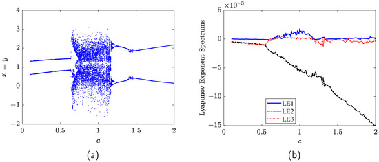 There are three parameters , and c in the financial system (1), and they exhibit chaotic behavior when , , and . If one wants to control the system through its parameters, which parameter will be more effective? Therefore, a further discussion of this problem is given by the bifurcation with respect to the parameters, and the bifurcation of system (1) is shown in Figure 2a according to the bifurcation algorithm of a dynamical system in Algorithm 1. Meanwhile, the Lyapunov exponent spectrum is also shown in Figure 2b.