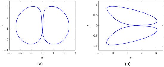 Based on the Lyapunov exponent spectrum and the bifurcation diagram with respect to parameter c, the system (1) exhibits chaotic behavior when , but it exhibits periodic behavior when . So, the dynamic behavior of the system (1) can be controlled by the demand elasticity of the commodity c. For example, the attractor of the financial system is shown in Figure 3 when . Obviously, it can be in a periodic state when the parameter c changed from 1 to 2.