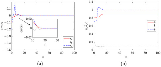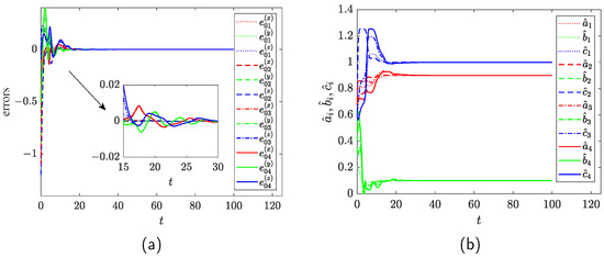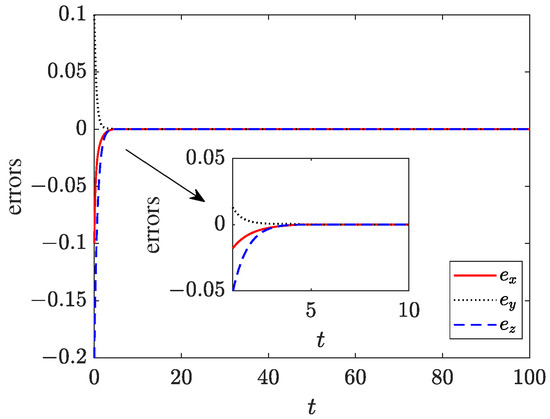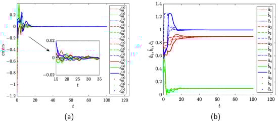 The synchronization errors , and are shown in Figure 4 by Matlab R2020b. Obviously, the master–slave systems have reached consensus as .