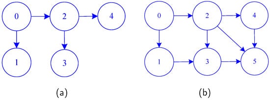 The network structure of leader–follower multi-agent. (a) Five agents in Example 3. (b) Six agents in Example 4.