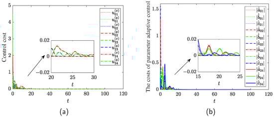 Costs of all agents in Example 3. (a) The control costs of . (b) The costs of parameter adaptive laws in Equation (18).