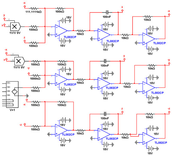 In Figure 11, the TL082CP denotes the dual input general-purpose operational amplifier, which is produced by IPC-2221A/2222, and it is used to solve the differential equations. For example, in order to implement the first differential equation in system (1) using the circuit, three operational amplifiers of the TL082CP in Figure 11 are used to simulate the operations of the model, i.e., the differential variable . Similarly, the circuits of other systems are designed based on this principle.