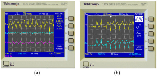 The results of circuit implementation of the consensus of master–slave systems (1) and (3). (a) The waveform diagrams of variables , and z displayed on the oscilloscope. (b) The corresponding waveform diagrams of variables x and of the master and slave systems displayed on the oscilloscope.