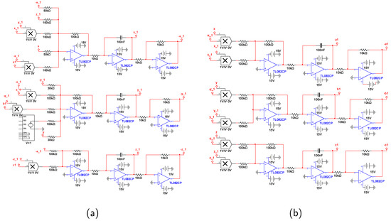 The circuit implementations for the consensus of two master–slave systems are shown, as the circuit design for the consensus of multi-agent systems is similar to that of two master–slave systems, so it is not added due to space limitation.
