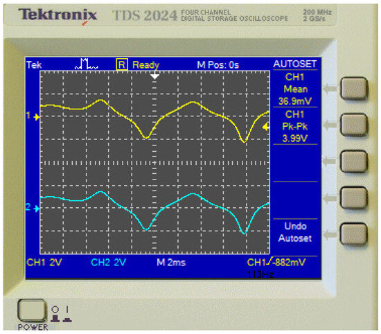 According to the circuit implementation of financial system (1) in Figure 11, the waveform diagram of the variables , and z in the oscilloscope of the circuit implementation is given in Figure 12a, and the attractor of system (1) based on the oscilloscope of the circuit implementation is shown in Figure 13 when . Obviously, the financial system (1) is in a state of chaos. Furthermore, the attractor of system (1) based on the oscilloscope of the circuit implementation is given in Figure 14 when , and it is in a state of period. Therefore, one can easily control the behavior of system (1) using the demand elasticity of the commodity c, and the results of the circuit implementation have once again verified the simulation results in Figure 1 and Figure 3.