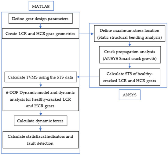In this study, the effects of tooth root cracks on the dynamic force and crack detectability performances on the LCR and HCR gears were investigated numerically. The STS and TVMS of the LCR and HCR spur gears were calculated by the FE method. A parametric non-linear 6-DOF dynamic model was created, and the dynamic forces were calculated. Using the statistical indicators, the authors attempted to predict the cracks. The flowchart of this study can be seen in Figure 1. To sum up, it was determined that HCR gears have a better load-carrying capacity and lower dynamic forces, but the LCR gears have better crack detectability performance than the HCR gears.