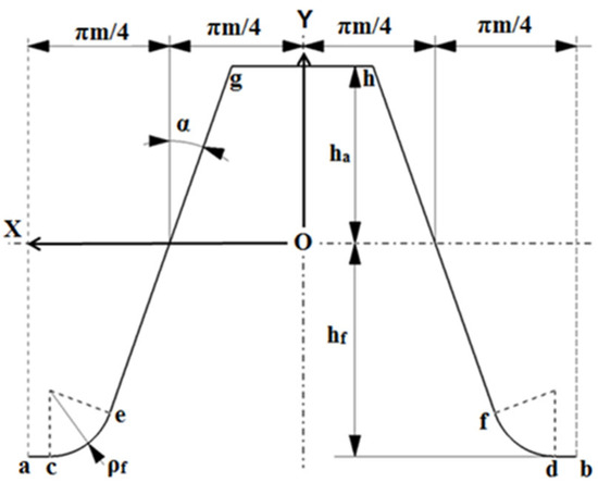Although there are different gear profiles that satisfy the law of gearing, the involute profile is the most used profile in gear geometry today due to its advantages such as ease of manufacturing, not requiring precision of the distance between the axes for its operation, and the ability to manufacture different gears using the same tool. Gears with an involute profile are basically formed by the combination of two different curves, the side surfaces of which are involute and the root parts of which are trochoid. There are many studies in the literature on the design of gears with involute profiles (Colbourne [25], Litvin et al. [26]). In this study, mathematical modeling of the gear geometries was undertaken using the rack-type cutting tool, and 2D CAD geometries were created. The cutting tool reference profile used in creating the models is shown in Figure 2.
