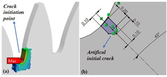 Determination of crack initiation point: (a) FE bending stress result; (b) artificial initial crack.