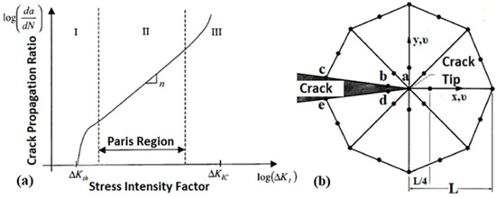 (a) Regions of fatigue crack propagation; (b) quarternode, isoparametric, finite element model with a six-node triangular tip [28].