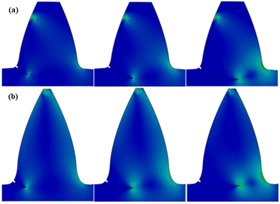 Crack paths for LCR and HCR gears: (a) ha = 1 hf = 1.25, 1.5–3–4.5 mm; (b) ha = 1.5 hf = 1.75, 1.5–3–4.5 mm.