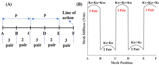 Meshing of LCR gears: (A) line of action; (B) calculation of mesh stiffness.