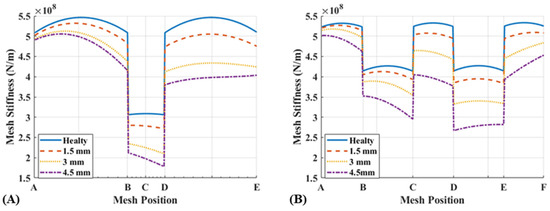 TVMS for different crack sizes, which are 0, 1.5, 3, and 4.5 mm, is calculated numerically. The variation of TVMS for LCR (Case I) and HCR (Case V) gears, depending on the mesh position, is shown in Figure 8. The change of TVMS for other cases can be seen in Figure A4 in Appendix A. The HCR gears’ TVMS values are higher than the LCR gears for healthy and all crack sizes, due to more gear pairs taking part in power transmission. When the contact ratio increases, addendum and total tooth height increase; thus, the TVMS is decreased. Moreover, the regions where power is transferred by the three tooth pairs in the HCR gears increase considerably. The mesh stiffness of both LCR and HCR gears decreases significantly with the formation of the tooth root cracks. When the cracks propagate along the tooth width, the TVMS decreases continuously. As the crack progresses, TVMS decreases less in the HCR gears compared to the LCR gears.