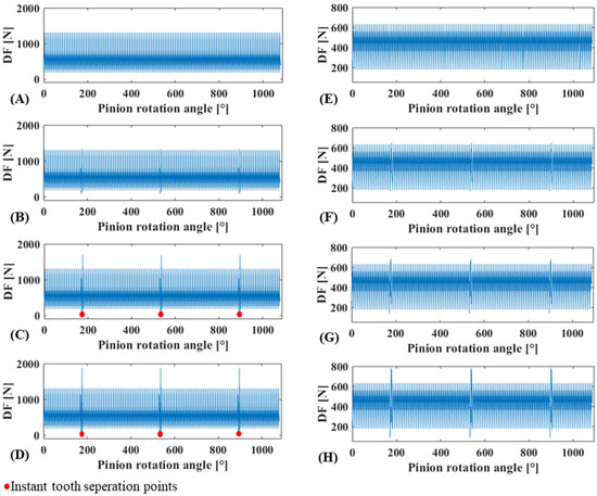The change of dynamic force obtained from the dynamic model depending on the pinion rotation angle is given in Figure 10. The dynamic forces for the LCR gears (Case I) are seen in the left column and the dynamic force for the HCR gears (Case V) is seen in the right column. Dynamic analysis results obtained for other cases are shown in Figure A5, Figure A6 and Figure A7 in Appendix A. The dynamic force changes obtained during three complete pinion revolutions were examined for each gear design examined in this study. The power is transferred through at least two gear pairs in HCR gears, whereas power is transferred through at least one gear pair in LCR gears. Therefore, it is seen that the dynamic forces for HCR gears are lower than the LCR gears. During power transmission through healthy teeth, the force occurring on each tooth is similar. However, when the contact is in the cracked tooth, the dynamic forces increase suddenly. The amount of dynamic force increases with increasing crack length in both LCR and HCR gears. The amount of dynamic force increases with increasing crack length. The dynamic force in LCR gears is instantly zero in the cracked tooth, as seen in Figure 10C,D. This situation indicates that the contact between the teeth is momentarily lost. The effect of the crack on the dynamic force decreases as the contact ratio increases.
