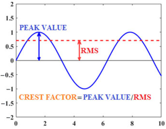 The crest factor is defined as the ratio of the maximum positive peak value in the signal to the RMS value. In healthy gears, it is expected to be between 2 and 6. For a sine function, the relationship between the crest factor, RMS, and the maximum point of the signal is given in Figure 11.