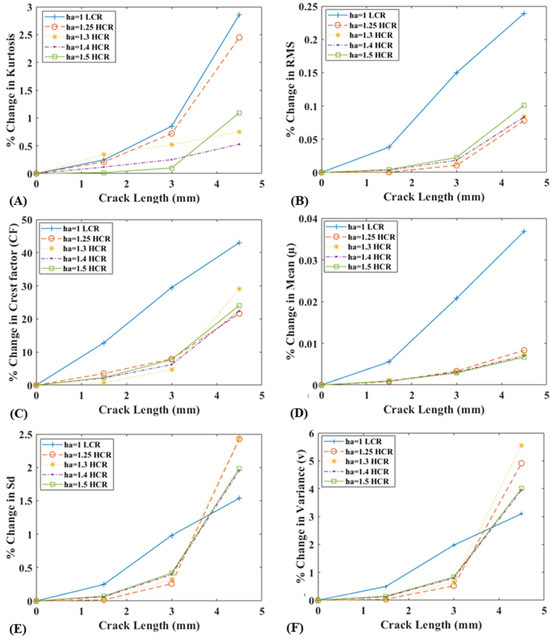 The crest factor is defined as the most sensitive indicator for the detection of tooth root cracks in both LCR and HCR gears. Even at the early levels of the crack, the amount of change in crest factor is around 10%. When the crack reaches 4.5 mm, it is seen that the percentage change is around 30–40%. On the other hand, the mean is the most insensitive indicator for the detection. It is determined that the % change of the mean at the maximum crack level is very limited (around 0.04 for LCR gears and 0.01 for HCR gears). Other indicators vary by around 6% to 0.5% from case to case.