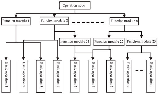 Each operation task corresponds to an operations chain. To obtain the operations chain for a specific task, the target cascading method can be utilized to decompose the task into basic operations and to analyze their interrelationships. In general, the decomposition of a task is implemented by professionals related to manipulating the equipment. According to the task requirements, the function modules are decomposed first, and then each module is further decomposed into basic operations, as shown in Figure 3. A specific task can be decomposed into multiple functional modules with a fixed sequent relationship, which will be nodes in the chain. In each node, there may be three types of function modules, as shown in Figure 3: (1) direct decomposition into one or more basic operations, such as function modules 1, 21, 22, and 23; (2) combinations of basic operations and function modules, such as function module 2; (3) combinations of function modules, such as function module n. Eventually, all functional modules will be decomposed into basic operations. During decomposing, the relationships among functional modules or basic operations will be determined and recorded. The recorded relationships will be applied to build the tree. It should be noted that the basic operations corresponding to each function module can overlap, meaning that one basic operation can correspond to multiple function modules.