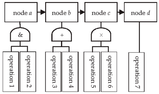 The operation tree is comprised of basic operations organized according to the logical relationships, as shown in Figure 1. The operation shown in the figure refers to the basic operation. The vertices of the operation tree correspond to the operation nodes. The whole tree is formed by basic operations and their function combination using logical relationships of “AND” (&), “OR” (+), and “MEX” (×). Each function can be composed of basic operations, or function combinations of any of the three relationships mentioned above. It forms a tree-like structure that combines all operations of a chain node by function analysis. To obtain the functionality of an operation node, multiple paths may be derived from the tree. Additionally, the operation tree model facilitates search implementation and can incorporate more information relevant to the assessment. It is important to note that there are only logical relationships between basic operations and operations combinations in the operation tree, with no sequential relationships. Sequential relationships are only reflected in the operations chain.