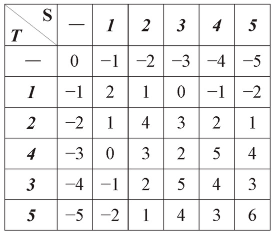 To start the iterative formula, the first value is . The first column values can be calculated by , and the first row values can be calculated by . Therefore, the score matrix shown in Figure 5 is obtained based on the iterative formula.