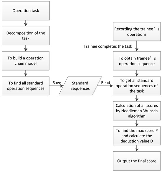 There are two nearly independent parts to implementing the methodology. The first is to build the operations chain model according to the operation task, and then to form multiple standard operation sequences. The second is to record the trainee’s operations, and then to score using the Needleman–Wunsch algorithms. The connection between the two parts is the multiple standard operation sequences. The first part is to form and save the sequences. The second part is to read and use the sequences. The flow chart is shown in Figure 7. The left part is the first stage of the methodology, and the right part is the second stage. The connection is the saved standard sequences.