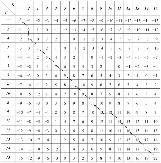 To obtain meaningful results, the match score should be higher than the mismatch score, and the “indel” score should be higher than the mismatch score. In this paper, when two sequence elements match, the score adds 2, when they do not match, the score subtracts 2, and when they are misaligned, the score subtracts 1, i.e.,