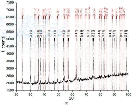 Mössbauer spectroscopy was performed using the Express Mössbauer spectrometer MS1104Em (Southern Federal University, Rostov-on-Don, Russian Federation). α-Fe calibration was performed for all samples. The source of gamma quanta of Co57. A set of Mössbauer spectra was produced at room temperature. The following designations are noted in the text: Is is an isomeric shift, mm/c; Qs is a quadrupole splitting, mm/c; H is the magnetic field on the Fe nuclei, mm/c; S is the area of the component; and G is the line width, mm/c.