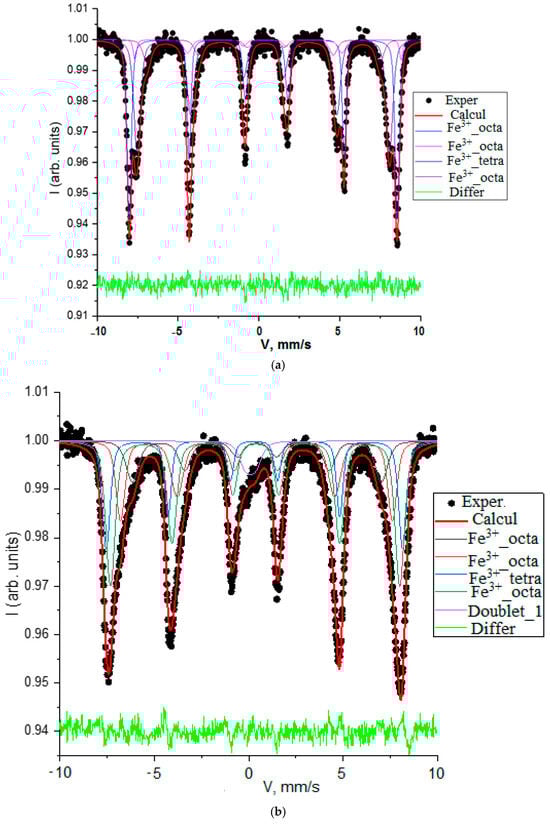 The Mössbauer spectra of the obtained magnetic composite СoFe2O4/PVP (Figure 2b, Table 3) showed the contents of trivalent iron ions in tetrahedral and octahedral environments, and also have a doublet spectrum. The parameters of this doublet included isomeric Is shift and quadrupole splitting. The decrease in effective fields can be explained by a decrease in the particle size of cobalt ferrite stabilized by PVP (particle diameter is less than 16 nm). Surface stabilization leads to a decrease in the size of ferrite nanocrystallites in nanocomposites.