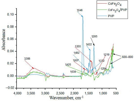 IR spectra of CoFe2O4, CoFe2O4/PVP, and PVP.