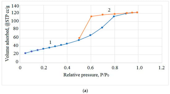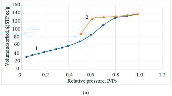 Textural properties were studied by analyzing N2 adsorption–desorption isotherms at −196.15 °C obtained on a Quantachrome NOVATOUCH LX4 adsorption analyzer equipped with long cells with a flask and an outer diameter of 9 mm. Before the analysis, the samples were degassed for 16 h at a temperature of 120 °C in accordance with IUPAC recommendations. The total pore volume (VT) and BET were calculated using the Quantachrome TouchWinTM software, version 1.22, in accordance with the procedure used in the works [34,95].