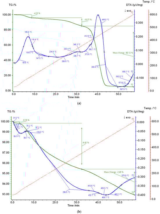 The thermogravimetry method was used to assess the crystallization and sorbed water content of the samples. The thermal analysis of the samples was performed on a DTG 60H derivatograph (Shimadzu, Kyoto, Japan). TGA curves were recorded at a heating rate of 5 °C/min in air; the sample weight was 20–30 mg.