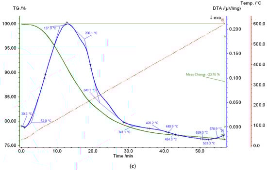 Figure 5 shows the DTA/TGA curves for CoFe2O4 (b) and CoFe2O4/PVP (c) nanocomposites in comparison with free PVP (a). The DTA/TGA results show that CoFe2O4 nanoparticles can improve the thermal stability of these nanocomposites. The measurements were carried out in a nitrogen atmosphere at a heating rate of 10 S/min. The TGA curve of pure PVP (Figure 5a) shows that, when the sample was heated from room temperature to 150 °C, 4.23% of the mass was lost, which is explained by the evaporation of the dissolved water molecules. This is confirmed by the endothermic effect characteristic of such a process on the DTA curve with a peak at 105.6 °C. The next mass loss of 10.77% with a small endoeffect at 325 °C is due to the evaporation of residual solvents and small molecules from the polymer structure. Weight loss of up to 80.12% is due to the decomposition or thermal degradation of the polymer itself. The DTA curve shows that this process begins at 373.6 °C and complete decomposition is achieved at temperatures above 500 °C, which is in good agreement with the literature data [96].