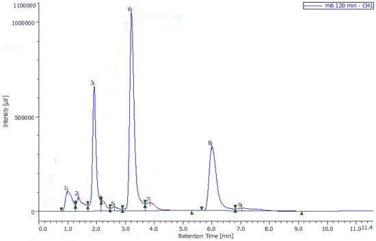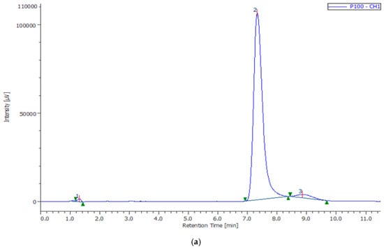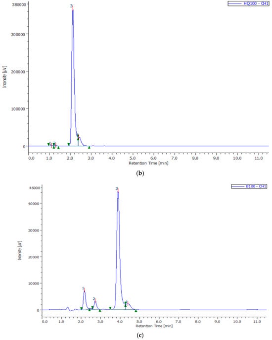 Figure 6 presents the chromatograms of the starting substances: phenol (a), hydroquinone (b), and benzoquinone (c).