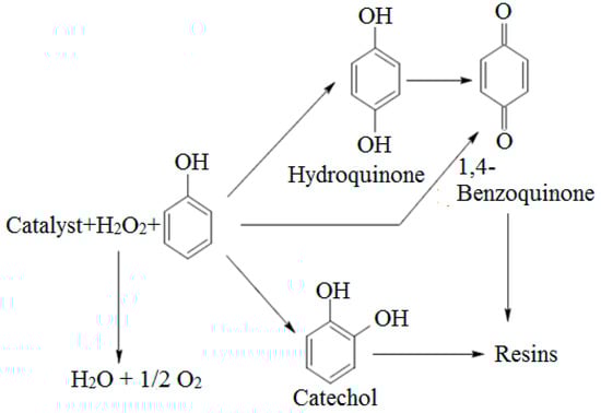 The proposed scheme for the oxidation of phenol with oxygen in the presence of an aqueous solution of hydrogen peroxide is shown in Figure 7.