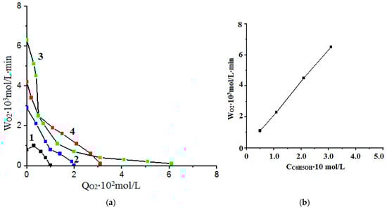 The reaction of phenol with oxygen in the presence of H2O2 on PVP-stabilized CoFe2O4 nanocomposites was carried out using the technique described in our previous articles [37,58,65] in a duck-type glass thermostatic reactor with intensive stirring (400 rpm), temperature heating, in an oxidizing oxygen atmosphere. To perform the experiments, 10 mL of phenol solution with an initial substrate concentration of 10 mmol/L was loaded into the reactor. Then, 0.02 g of the nanocomposite catalyst was added. The reactor was closed and purged with oxygen 3 times. Then, a given atmosphere (oxygen) was created in the reactor. The reactor was shaken until a constant volume of the gas phase was established within the experimental error, after which the remaining components of the system were quickly pressed through a glass tap. This moment was taken as the beginning of the reaction. The liquid volume in all experiments was 10 mL, and the gas volume was 180 mL. The temperature was maintained using a U-10 thermostat. The results were processed in coordinates W = f (Q), where W is the oxygen absorption rate (mol/L min) and Q is the amount of absorbed oxygen (mol/L). During the reaction, samples of the reaction mixture were periodically taken from the reactor (at the reaction moments of 0, 15, 30, 60, 90, and 120 min). The reaction mixture was analyzed by HPLC. HPLC was calibrated for the identification and quantification of many of the expected oxidized phenol intermediates (hydroquinone, p-nitrophenol, resorcinol, p-benzoquinone, pyrocatechol, trans-muconic acid, and phenol) [92].