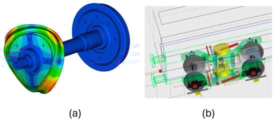 (a) Finite element model of the given wheelset symbolically depicted with a second order bending of the LHS wheel disc; (b) MBD model of the train with the reduced model built in.